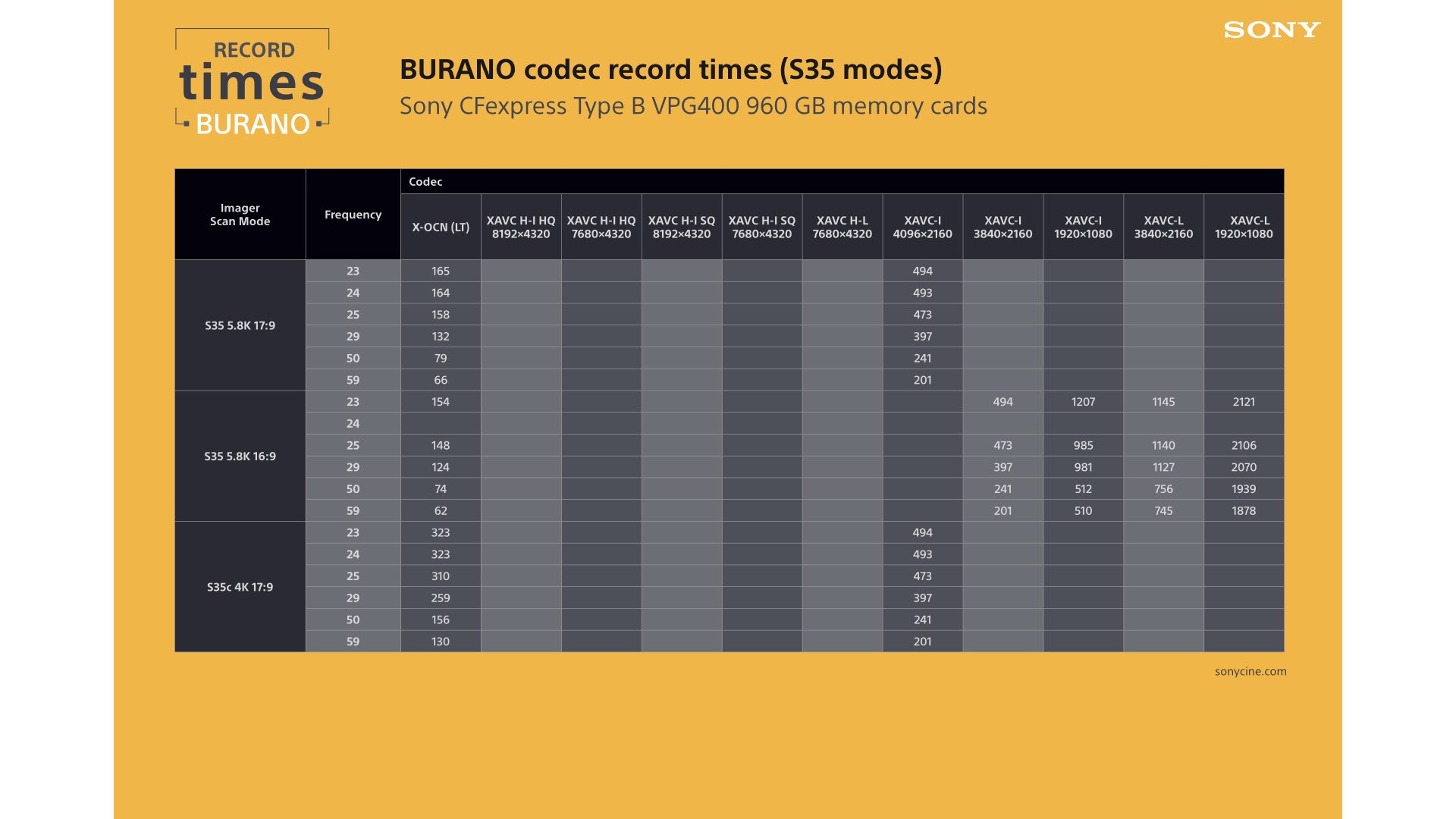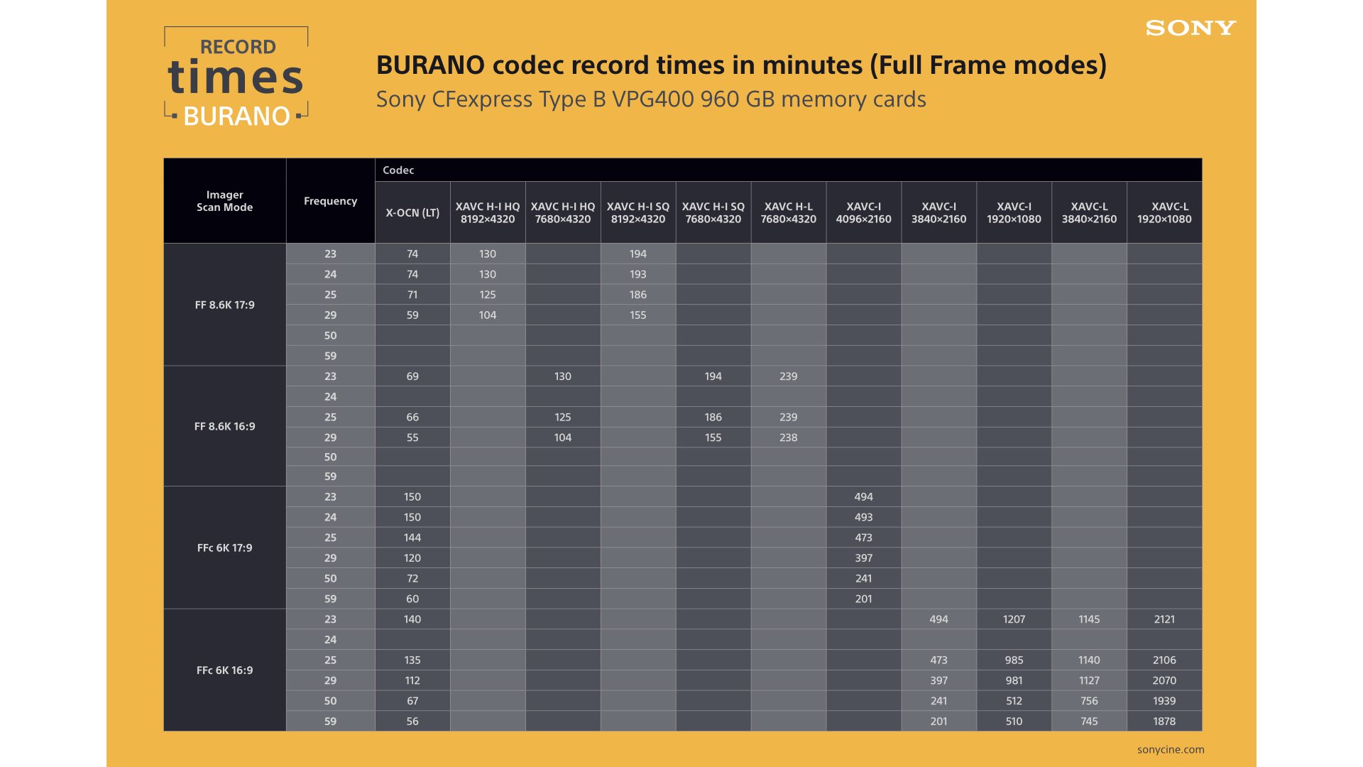 Sony menciona, ahora puedes descargar la carta de formatos de grabación de la Sony Burano junto con otras ayudas, el manual, pietaje de muestra y el simulador del menú de la cámara.