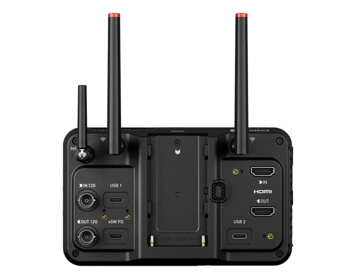 El monitor incluye una antena Wi-Fi y una antena AirGlu, que se atornillan a la parte trasera del monitor-grabador. Cuando no se necesitan, se incluyen unas tapas de plástico para proteger ambos puertos. Con el Wi-Fi integrado, puedes subir tus grabaciones directamente a ATOMOSphere, que incluye 20 GB de almacenamiento gratuito. Después, puedes pagar por uso o también puedes subir a tus cuentas en Dropbox o Frame.io.