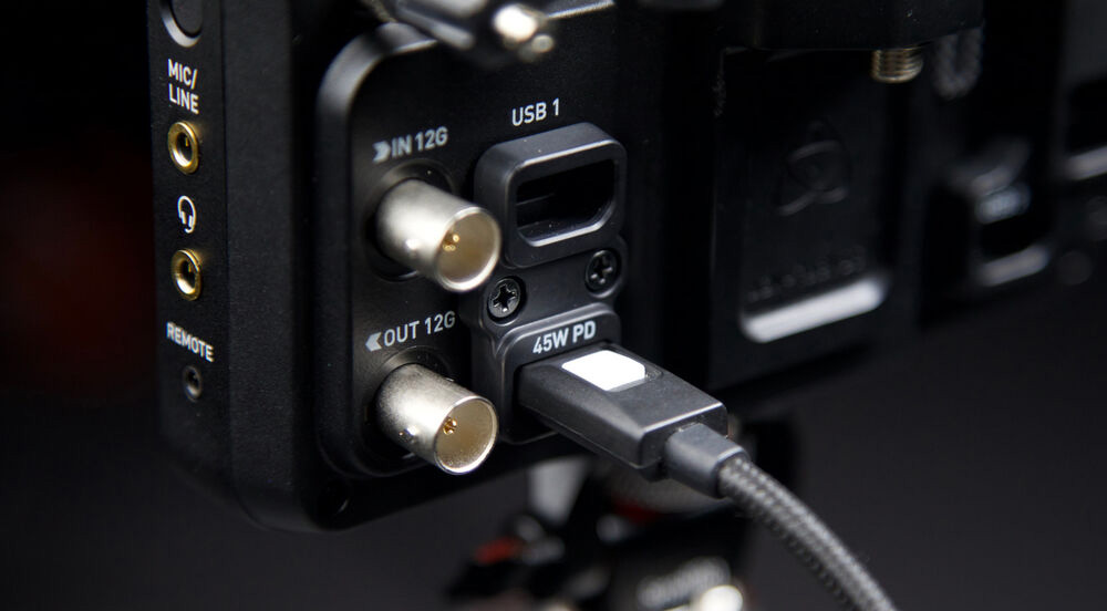 Como puede ver, hay un tercer puerto USB-C en la parte trasera del Ninja TX. Puedes usar este puerto para alimentar el Ninja TX, también a través de la placa de batería Sony NP-F integrada y finalmente con un eliminador de batería AtomX opcional, lo cual resulta muy práctico. Con una batería Sony NP-F970, la duración prevista es de aproximadamente 55 minutos en RAW 8K, así que si iras con batería considera tener varias o una fuente USB-C, afortunadamente ahora muchas baterías V-Mount incluyen un puerto USB-C.