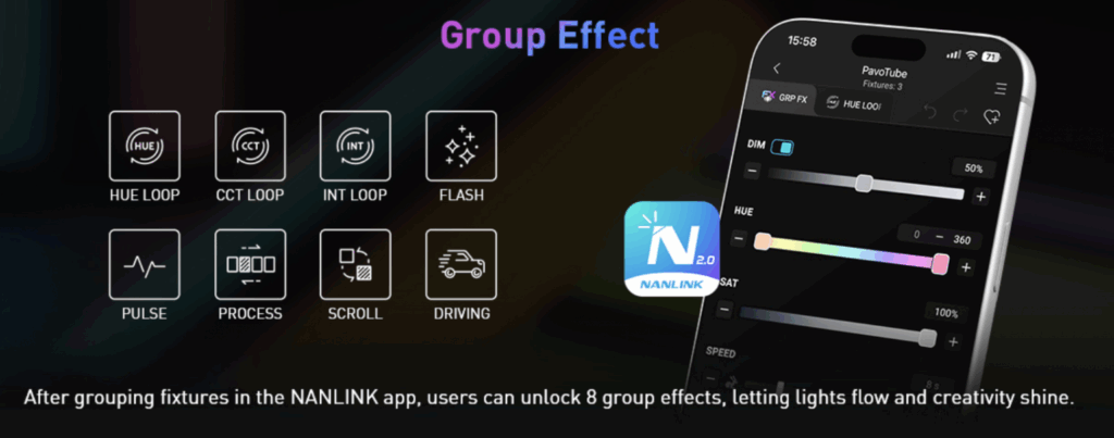 Además cuenta con 15 efectos de iluminación integrados que simulan escenarios reales. Al conectarse a la aplicación NANLINK 2.0, los usuarios pueden acceder a 8 efectos de grupo adicionales enlazando varios dispositivos, lo que permite configuraciones de iluminación sincronizadas para producciones más complejas.