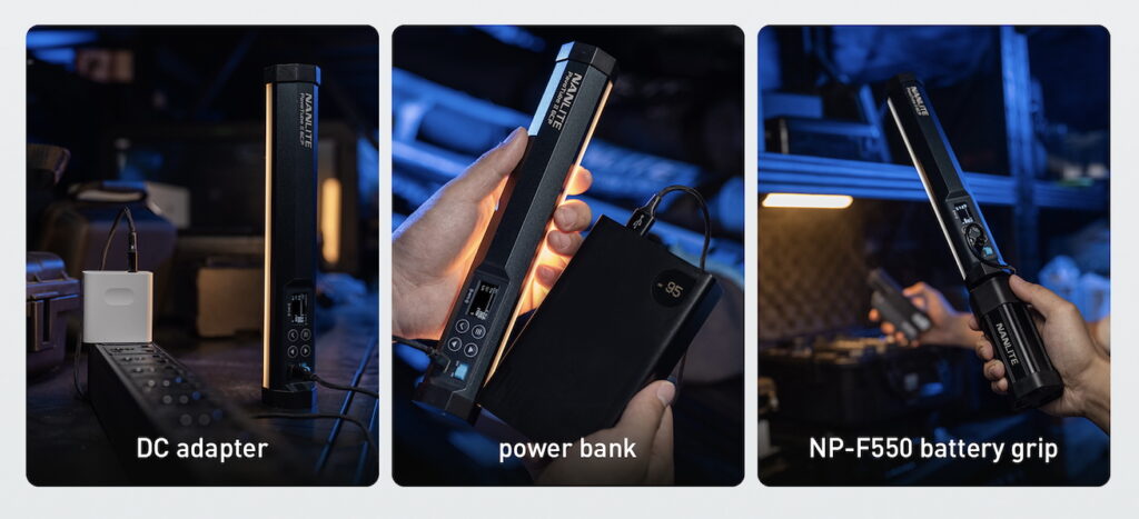 Si necesitas más tiempo de duración hay una empuñadura (grip) de batería opcional para baterías NP-F550 (7.4 V/2600 mAh), que suma 2 horas de autonomía. La unidad se puede alimentar o cargar mediante USB-C con un adaptador de CC de 5 V/2 A o un adaptador USB-C tipo PD, aunque NANLITE menciona que la salida PD es de 5 V y no admite carga rápida.