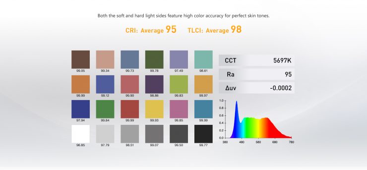 NANLITE menciona que los focos LED ofrecen una alta precisión cromática con un índice de reproducción cromática (CRI) promedio de 95 y un índice de color total promedio (TLCI) de 98. Además, dispone de tres niveles de brillo. Para ajustar la luz, basta con pulsar brevemente el botón de control para regular el brillo y mantenerlo pulsado para ajustar la temperatura de color.