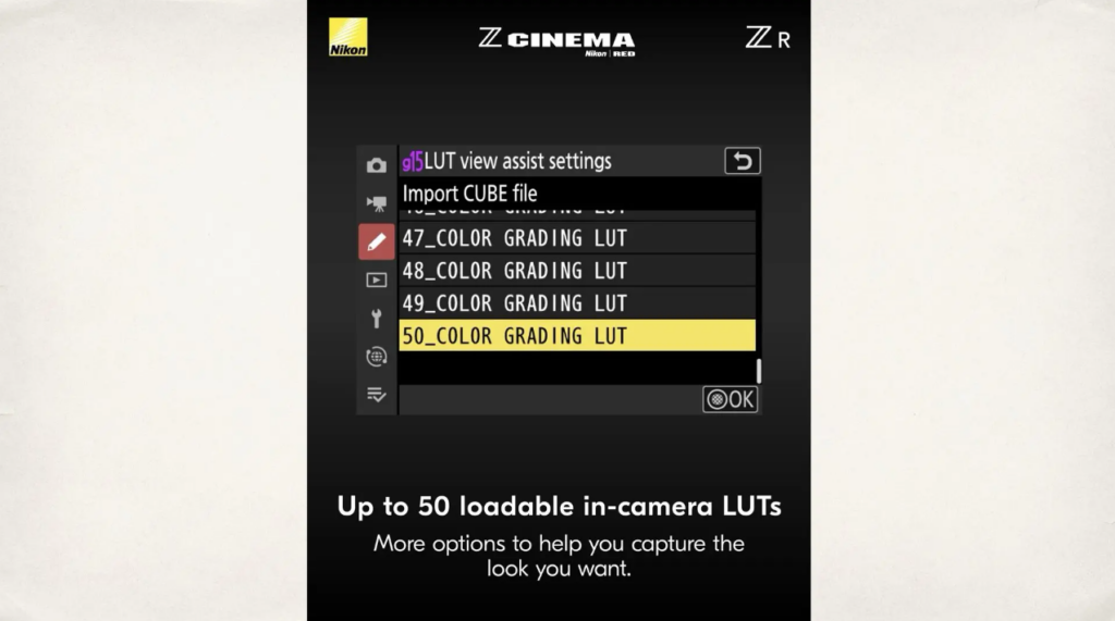- Las mejoras adicionales incluyen la opción de menú [Ahorro de energía de la lámpara de encendido], la posibilidad de configurar el [Tipo de archivo de vídeo] como [R3D NE de 12 bits (R3D)] en el menú de grabación de vídeo en el modo de disparo automático y la opción de ver hasta 50 LUT al importar desde una tarjeta de memoria mediante la configuración personalizada.