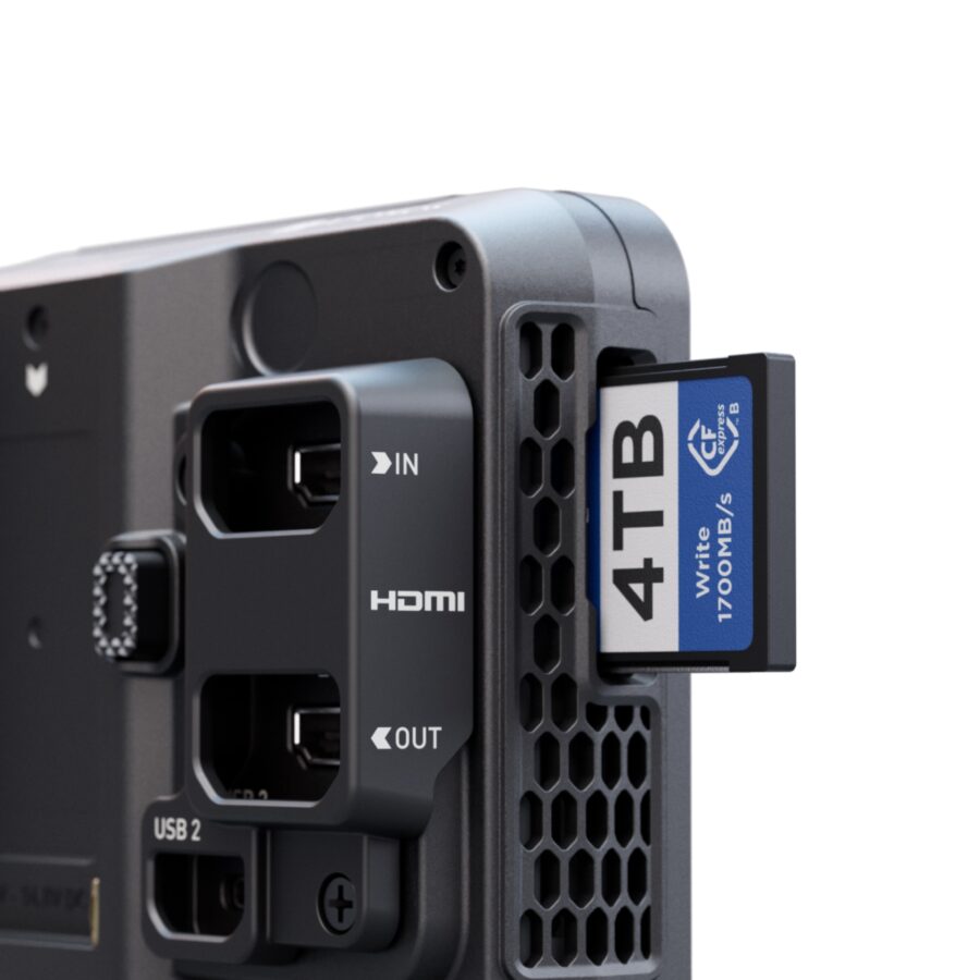 Igual que con el Ninja TX, ahora graba en tarjetas CFexpress Tipo B, a diferencia de las generaciones anteriores que usaban SSD de 2,5 pulgadas. Esto porque las CFexpress Tipo B proporcionan las velocidades de lectura/escritura más rápidas y necesarias para la grabación a alta tasa de bits de ProRes RAW a 6Kp30. Si requieres un almacenamiento más grande y económico, también se pueden usar unidades USB-C externas a través de los dos puertos USB-C de la unidad.
