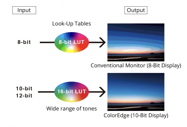 Su rendimiento de visualización de 10 bits, impulsado por un LUT de 16 bits, ofrece gradaciones excepcionalmente suaves y permite que el monitor reproduzca más de mil millones de tonos con gran precisión.