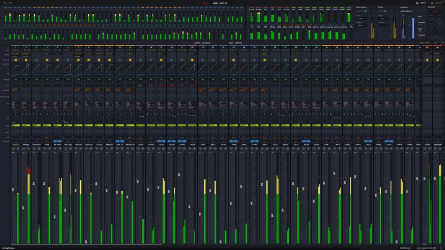 La lista de características incluye todo lo que los ingenieros de audio para radiodifusión llevan años solicitando a las soluciones de software. Fairlight Live se adapta desde unos pocos canales hasta cientos o incluso miles, según el hardware donde se ejecute. Cada canal cuenta con ecualizador de seis bandas, expansor/puerta de ruido, compresor, limitador y panoramizador integrados, con cuatro ranuras de efectos que pueden ampliarse hasta 24 plug-ins por canal mediante el sistema ChainFX. Es totalmente compatible con plug-ins VST y AU de terceros. Incluye un reproductor de cues integrado con 16 cues de audio y 16 MIDI, instantáneas para recuperar estados completos de la mesa de mezclas entre segmentos del programa, grabación y reproducción de pruebas de sonido virtuales y hasta 128 grupos VCA con soporte para anidamiento.