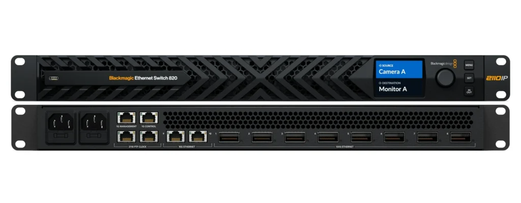 Para completar la capa de red, el switch Ethernet Blackmagic 820 ($2,295 USD) ofrece 8 puertos Ethernet de 100 Gbps y 2 de 10 Gbps con distribución de reloj PTP redundante, control NMOS dedicado y refrigeración frontal-posterior orientada a la radiodifusión. El panel de control para rack de monitorización ATEM (desde $995 USD) combina la conversión de monitorización IP a SDI/HDMI SMPTE-2110 con un panel de control para montaje en rack para los conmutadores IP ATEM Constellation.